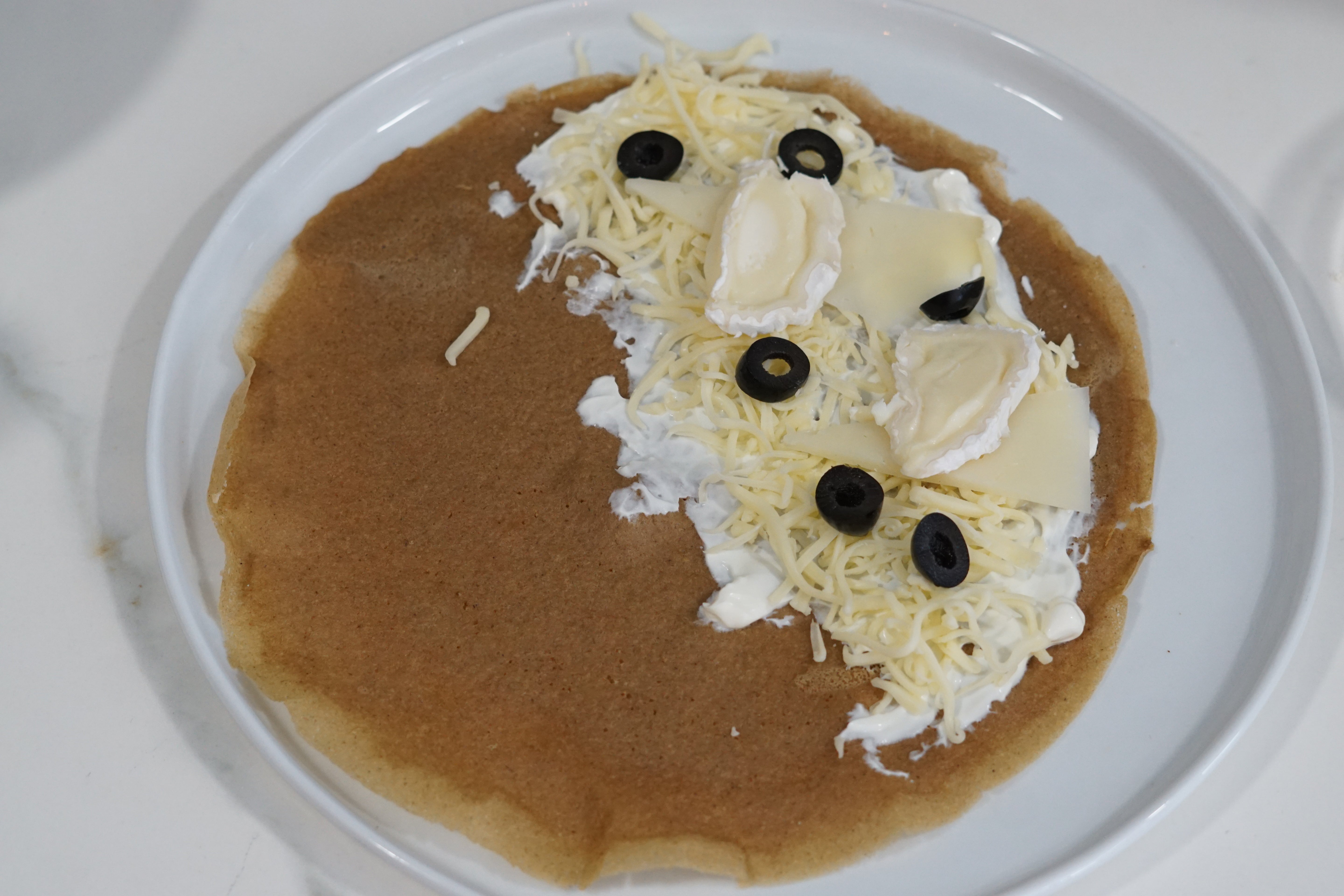 4. For the filling, spread a layer of cream cheese, add the three other cheeses and sliced black olives, then fold the crepe.