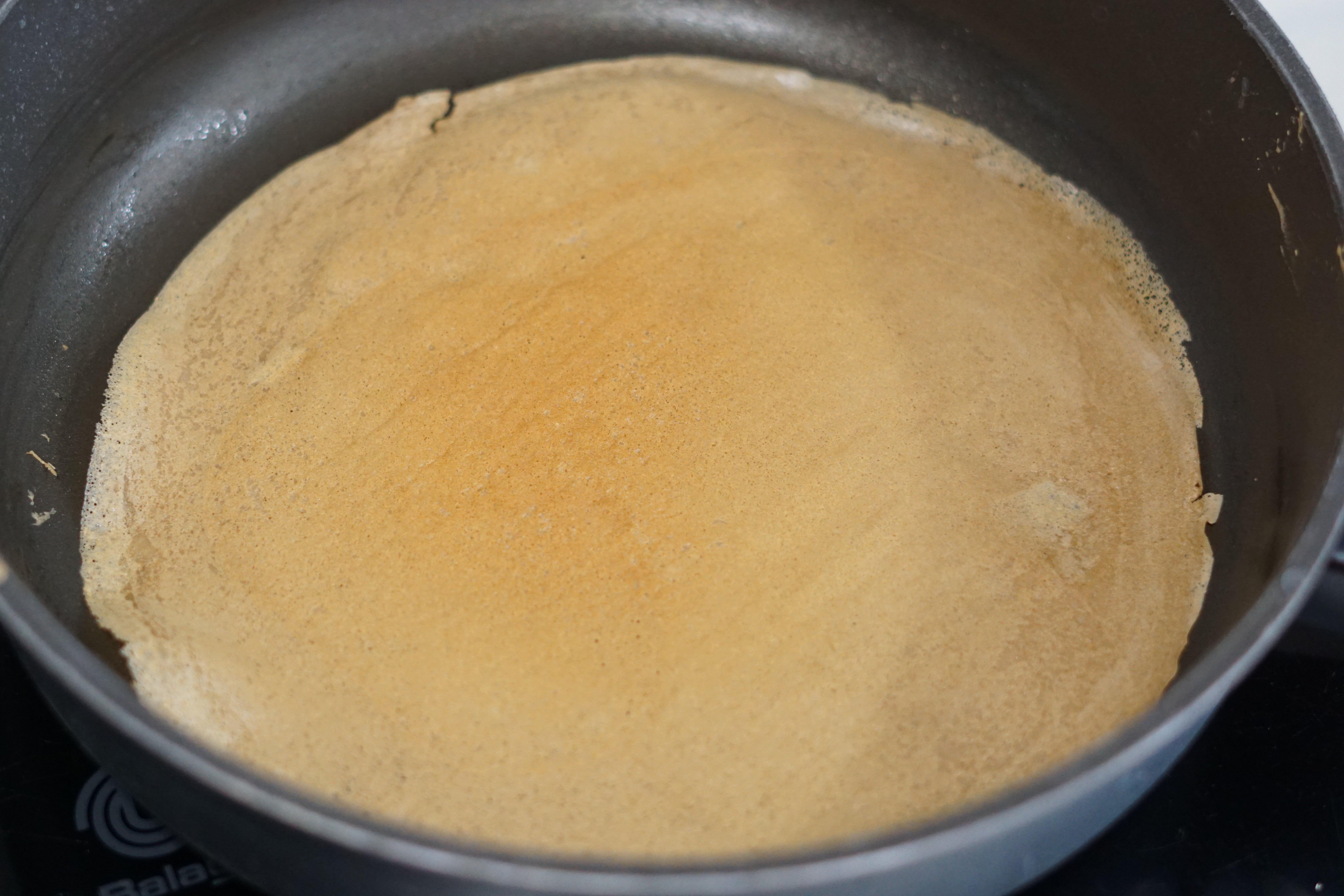 2. Lightly grease the pan, pour in a ladle of batter, spread evenly, and cook until set.