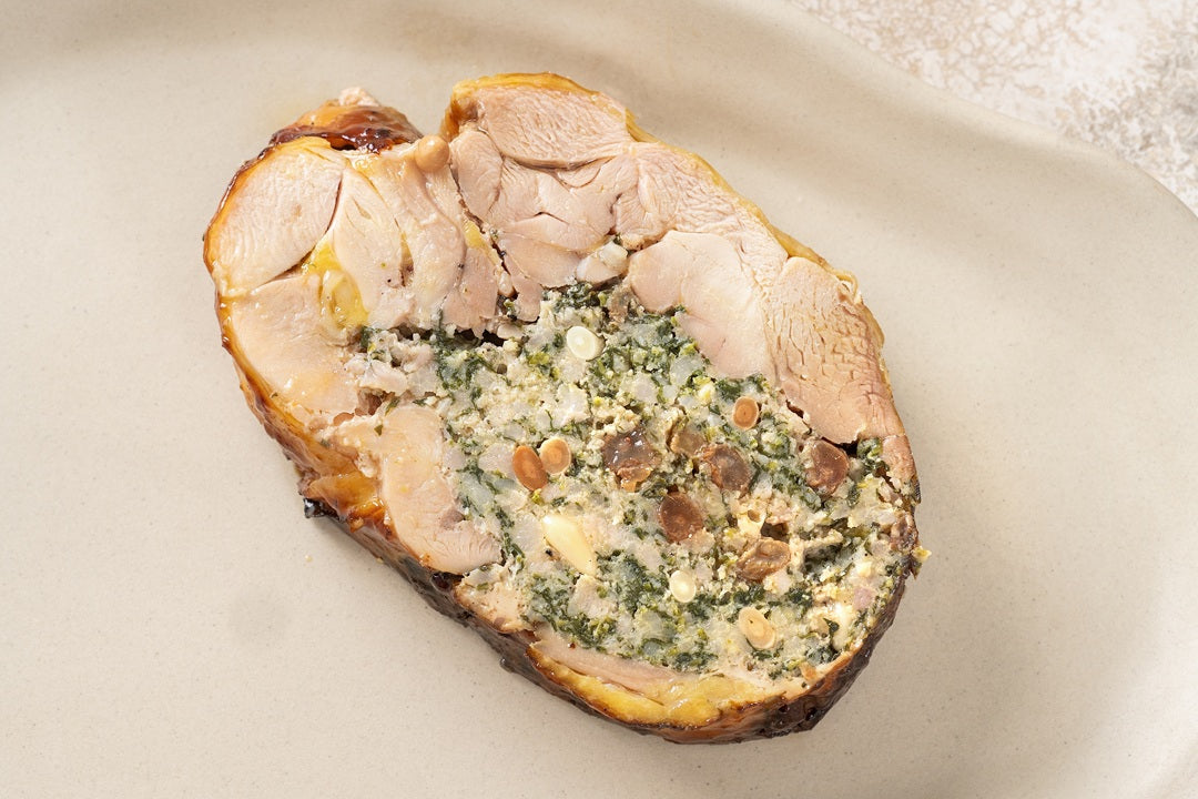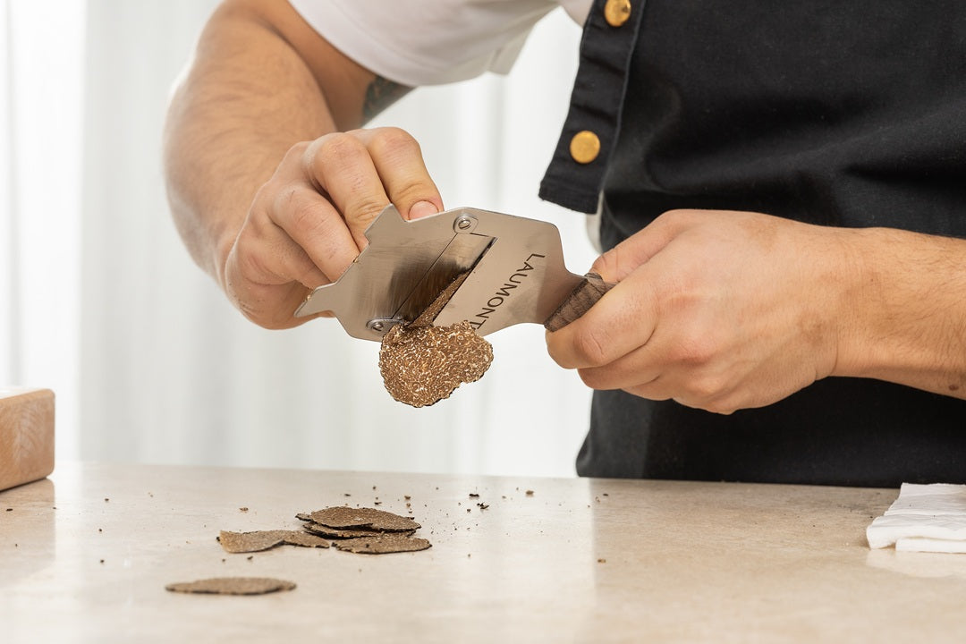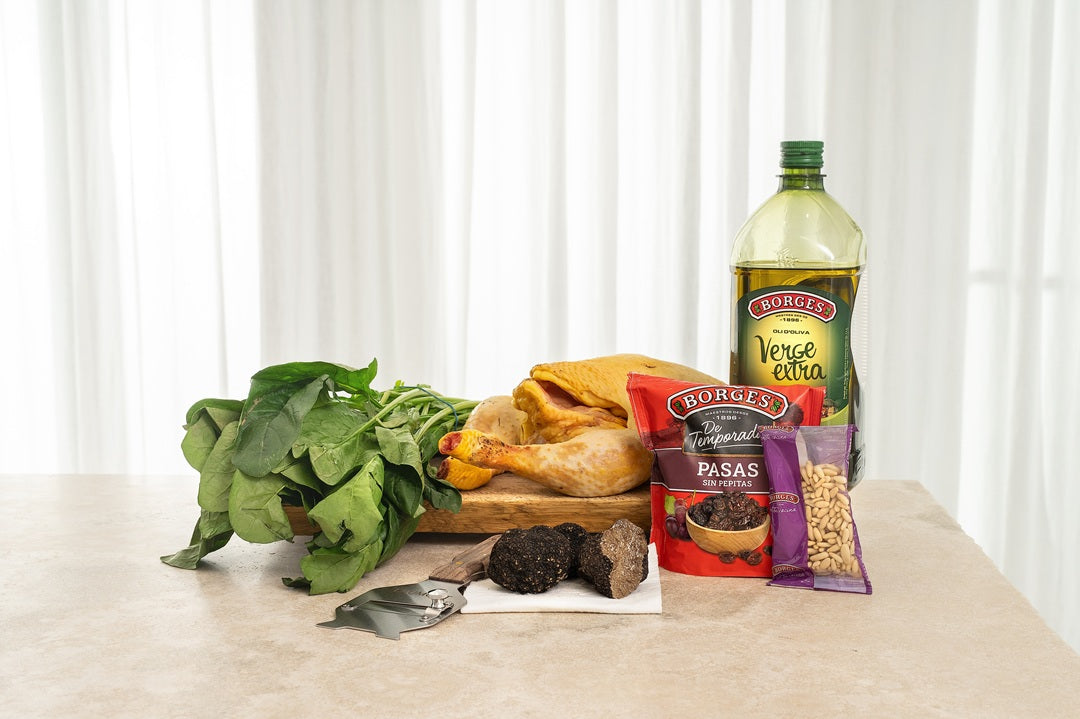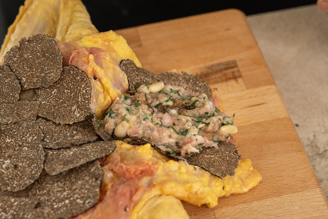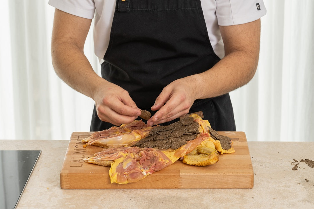 This elegant gourmet recipe brings together the deep aromas of fresh Laumont truffle with succulent free-range chicken, slow-cooked for perfect tenderness. The Catalan-style stuffing of pork, spinach, pine nuts, and raisins adds richness, while the apple and potato garnish offers a touch of sweetness to balance the dish. Ideal for festive dinners or refined gatherings, this recipe highlights the magic of cooking with premium truffle.