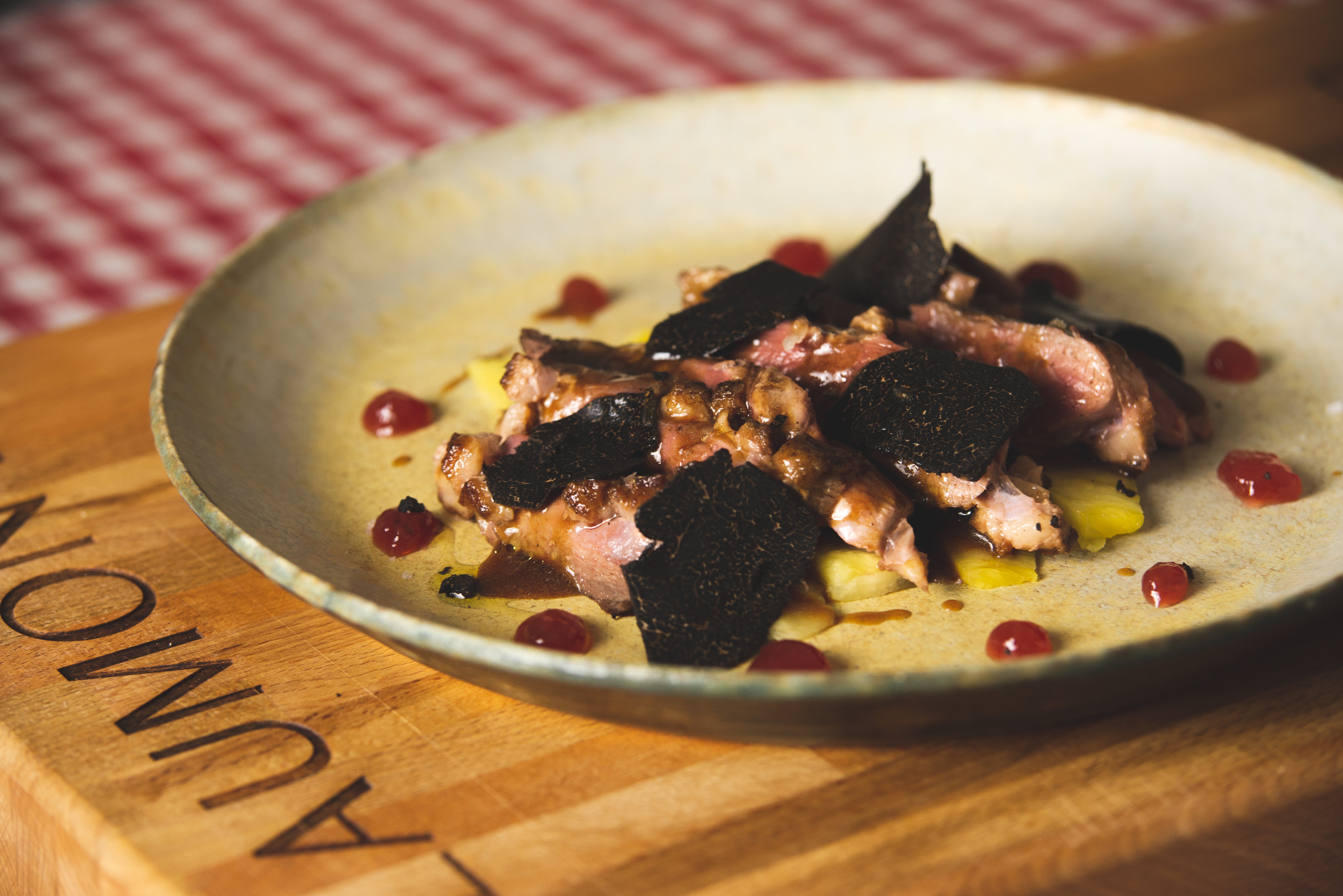This refined dish brings together the tenderness of perfectly cooked duck breast with the brightness of pineapple, the sweetness of strawberry jam, and the unmistakable aroma of Laumont fresh truffle. A sophisticated sweet-and-savory combination perfect for elegant dinners or festive occasions.