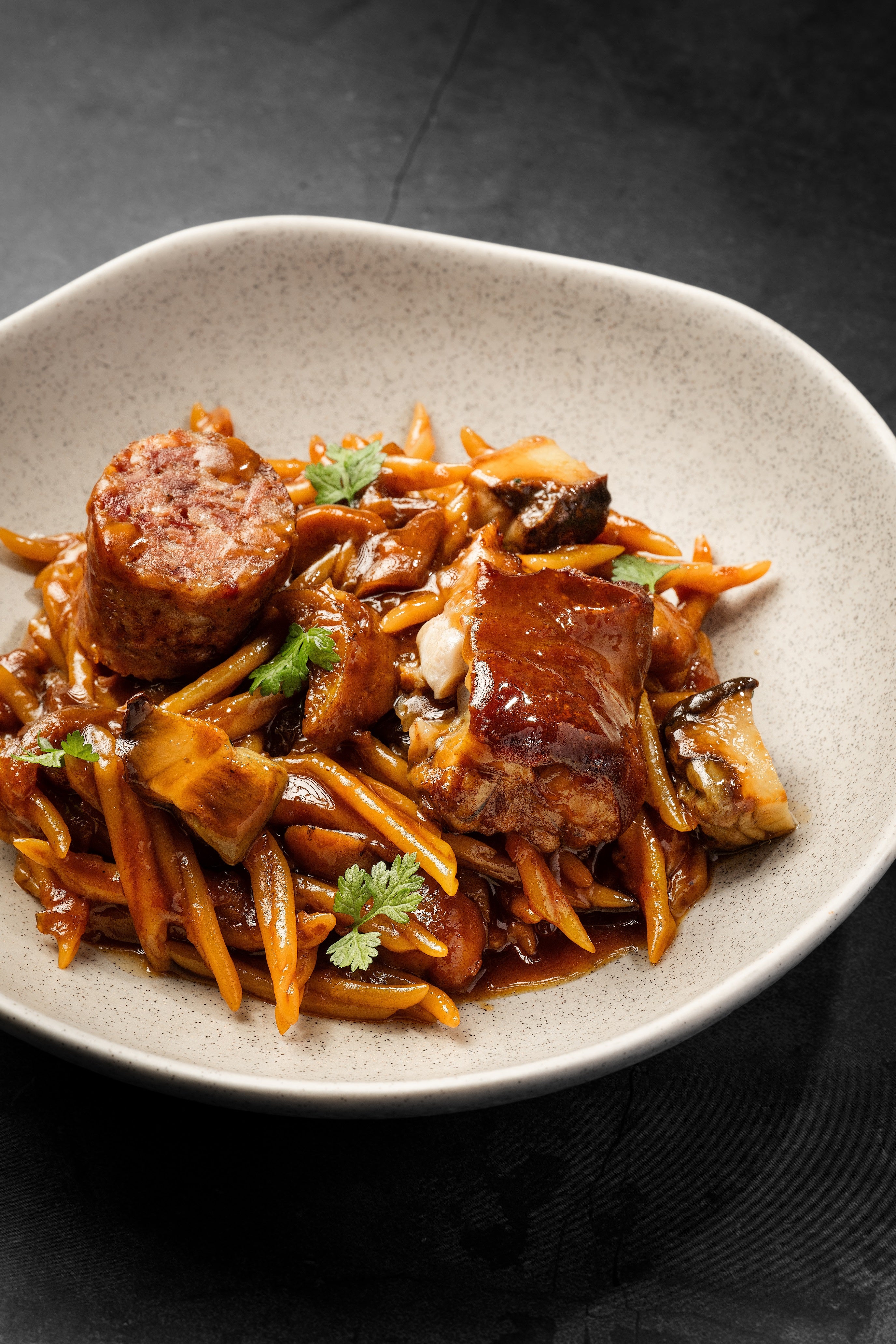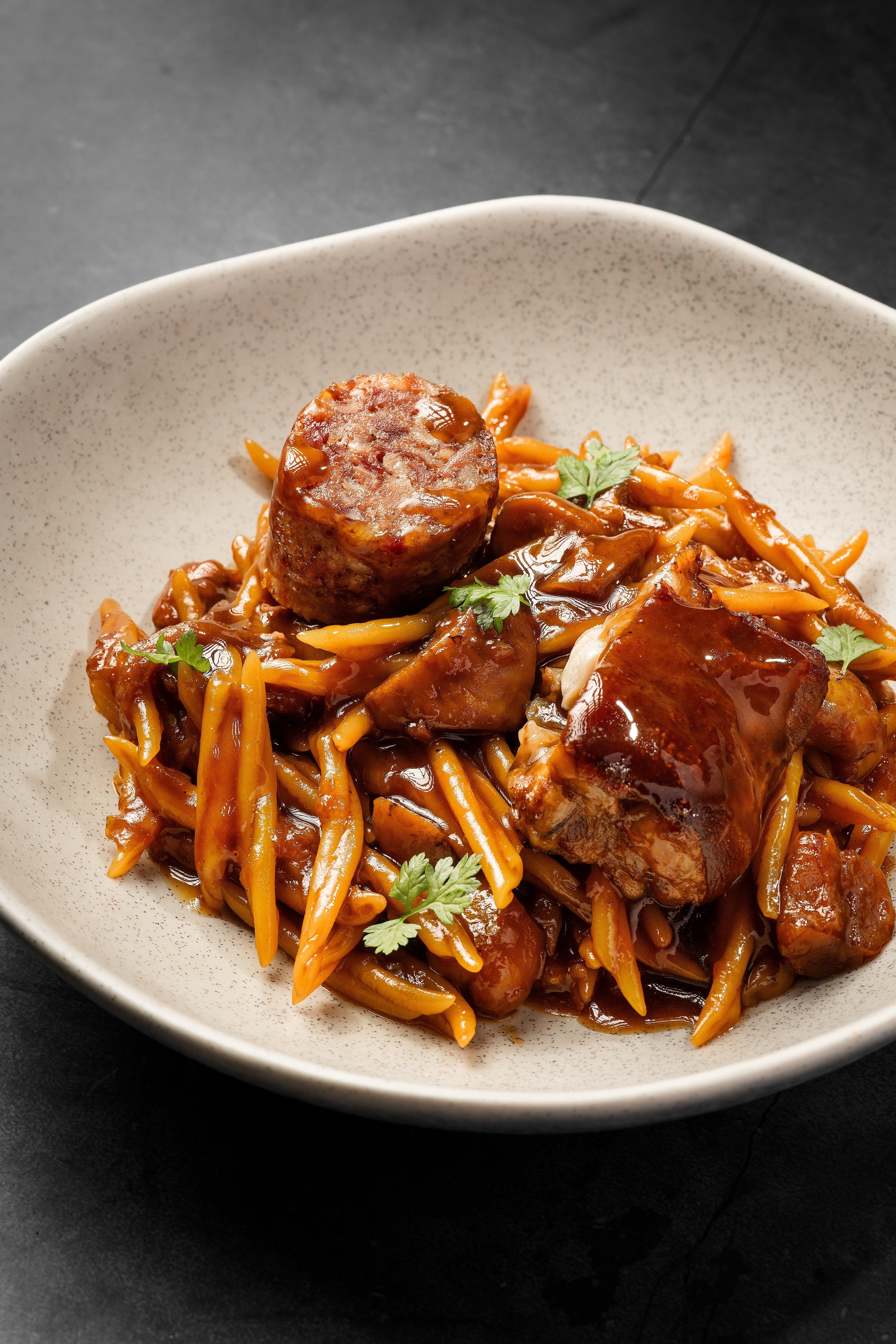 A traditional recipe with high-end culinary soul, where Laumont's frozen Boletus Tacos are the true stars. Their deep flavor and meaty texture blend with the intensity of the "botifarra del perol" (traditional Catalan sausage) and the silkiness of the pig's trotters, slowly simmered in a homemade chicken and pork stock. Part of this stock is reduced to a demi-glace to add shine and depth to the dish. The result is a rich, elegant stew that reinterprets the classic Catalan "fideus a la cassola" with Laumont's gourmet touch.