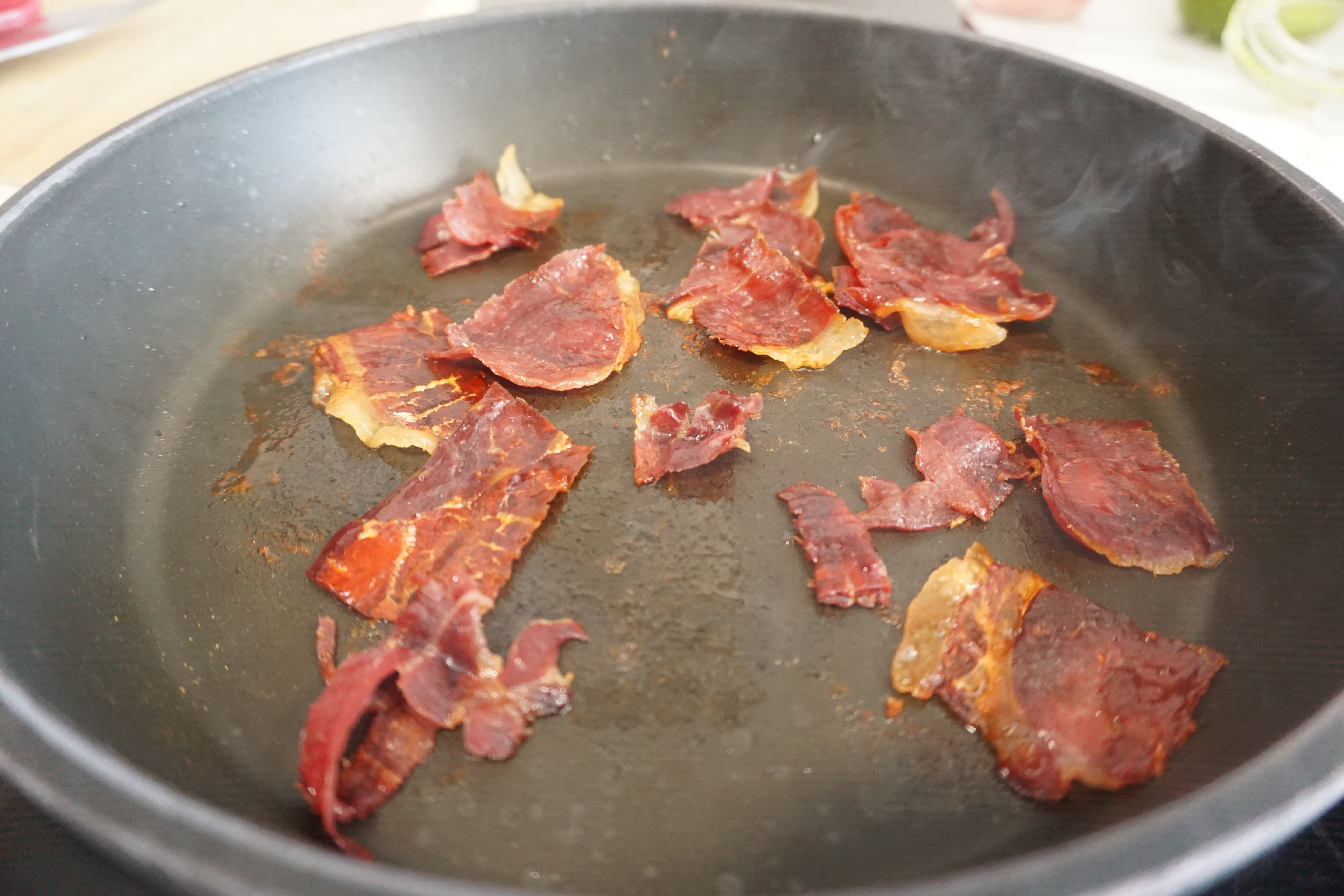1. Cook the ham in a pan with a few drops of olive oil until crispy and golden.