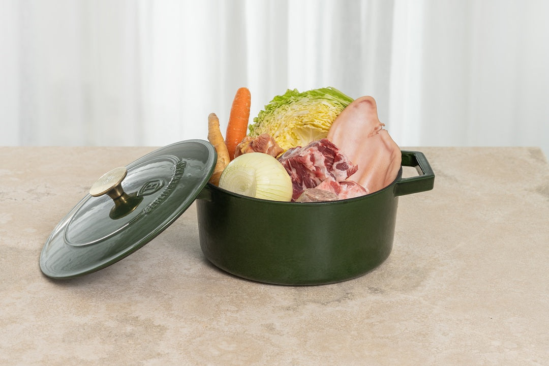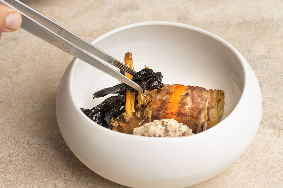 A modern take on Catalonia’s beloved winter stew, this reimagined escudella blends the deep, comforting flavors of traditional pot-au-feu with refined gourmet touches: Laumont black trumpets and camagrocs sautéed in rosemary oil, delicate truffled meatballs, and a pressed terrine of slow-cooked pork jowl. The result is a dish worthy of a festive table, where rustic tradition meets elegant plating.