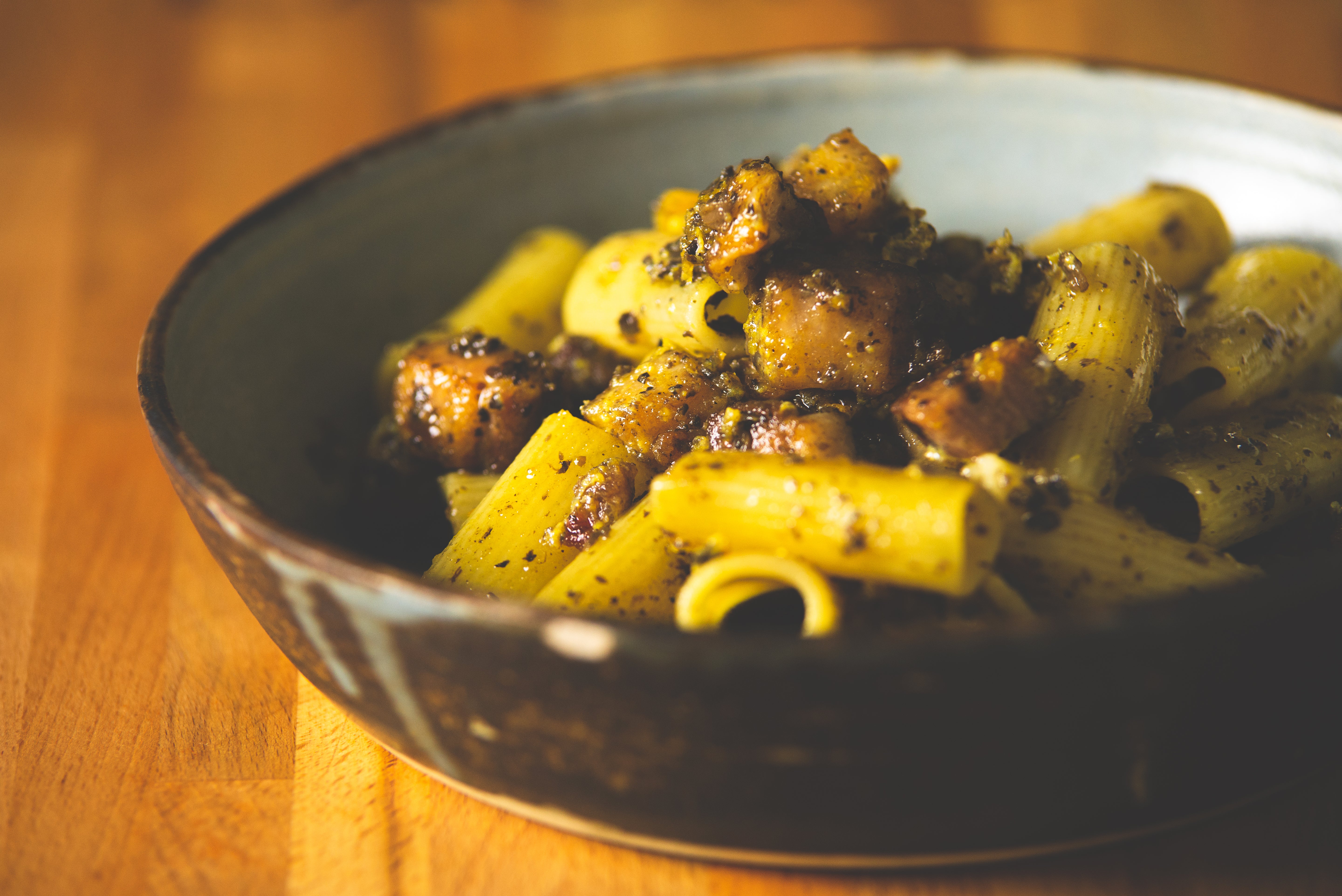 Sautéed rigatonni with tartufata, pork pancetta and egg yolk