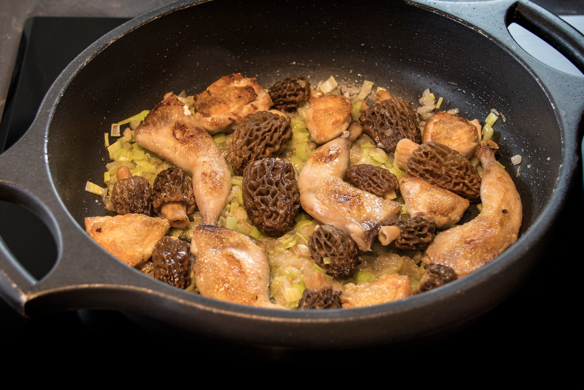 4. Once the onion and leek are soft, add the morels and turn the heat up.