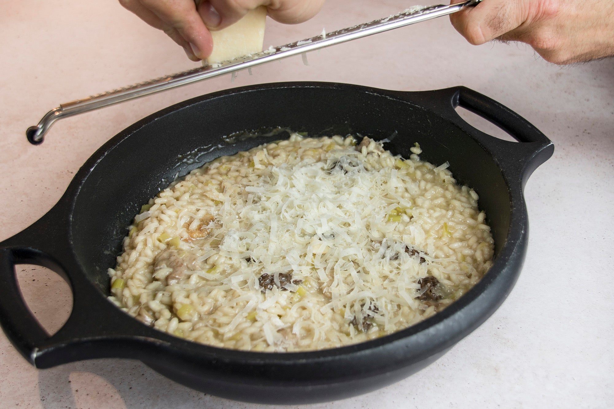 6. Then add the rice and add the poultry stock as the rice requires. When the rice has been cooking for 15 minutes, take it off the heat and add a few cubes of cold butter.