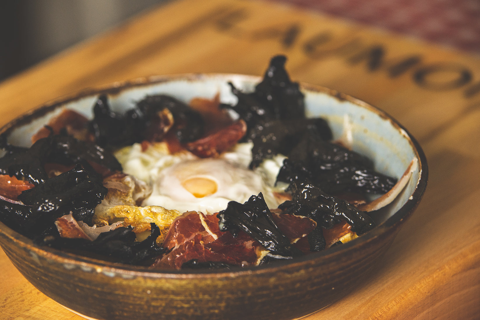 A comforting and flavorful dish showcasing the intense, earthy aromas of Laumont black trumpet mushrooms. This autumn-inspired plate combines the creamy richness of mashed potatoes, the golden crisp of a fried egg, and the deep umami of mushrooms, finished with the refined touch of Iberian ham.