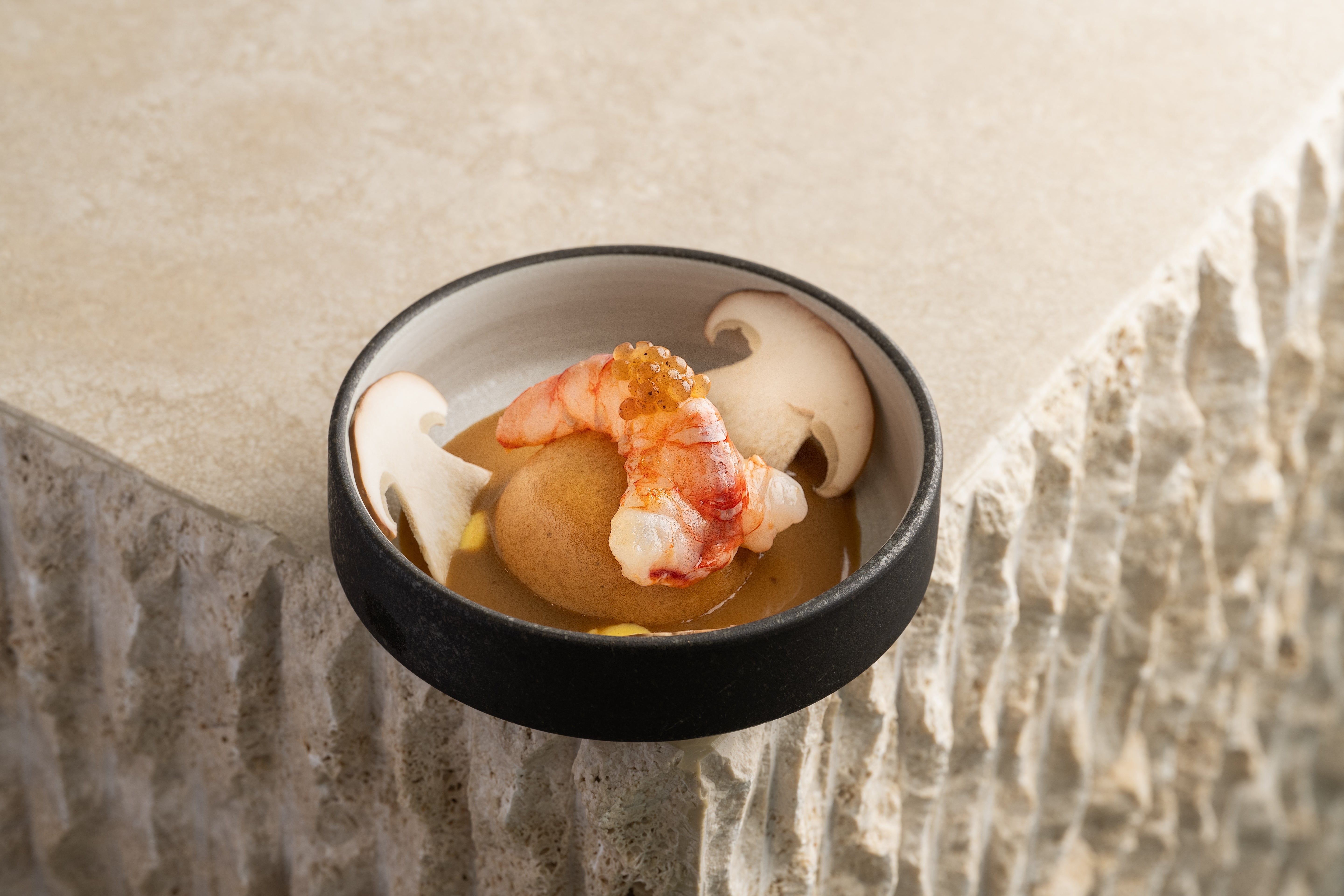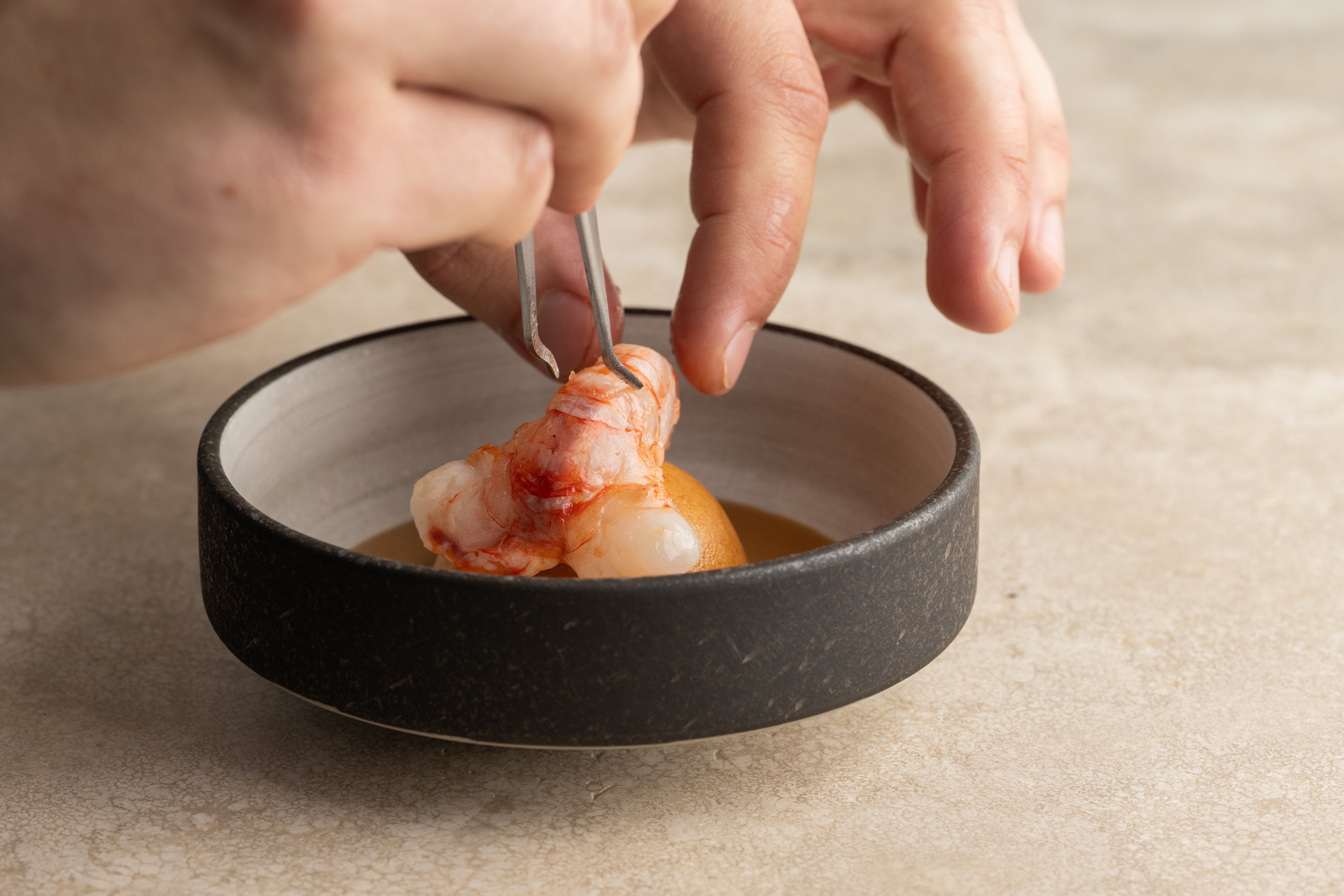 Finely dice the garlic, onion, carrot, and boletus. Remove shrimp heads and shells, reserving them to boost the flavor. Dice shrimp tails and set aside. Heat the olive oil in a pot and sauté garlic, then onion, followed by carrot until fully cooked. Add the boletus. Season with salt and pepper, blend until smooth, and pass through a fine sieve.