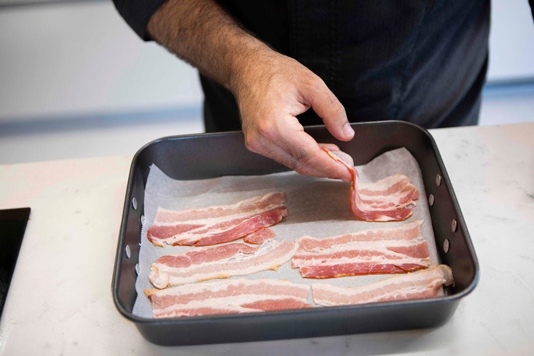1. Start by placing the bacon strips on a baking tray suitable for the oven.
