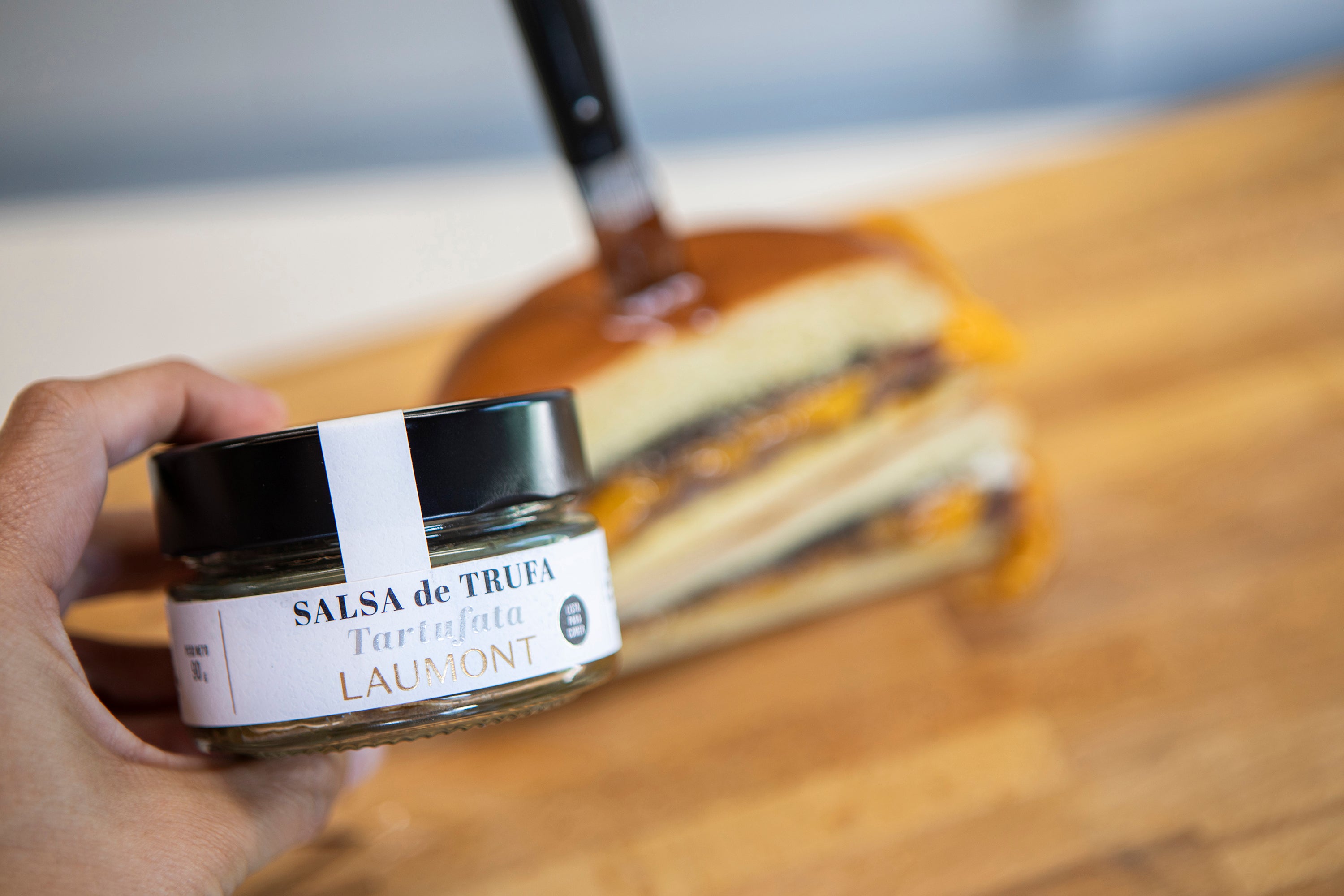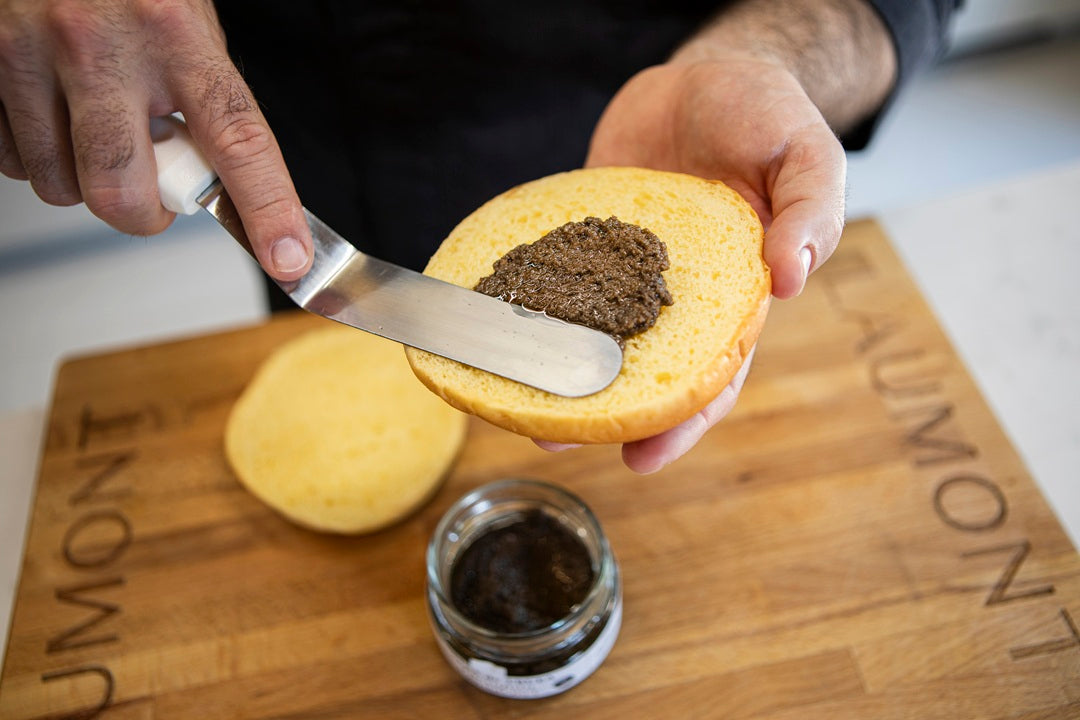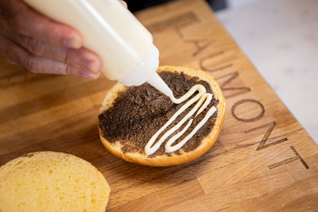 3. Meanwhile, spread the top halves of the burger buns with tartufata sauce and mayonnaise.