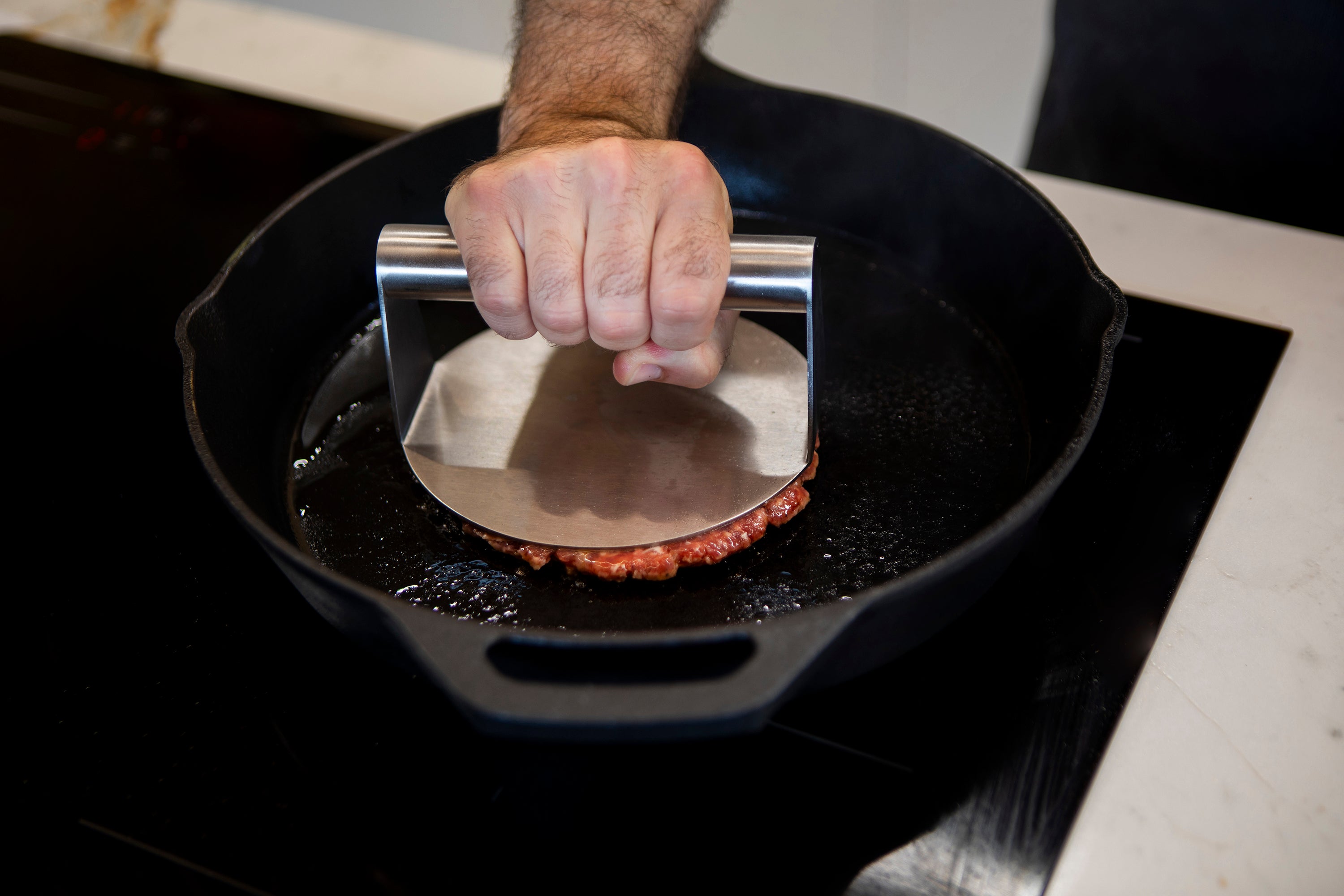 4. Place the burgers on a very hot griddle previously greased with a bit of olive oil. Press them down firmly using a spatula or a pressing tool, and sear on both sides.