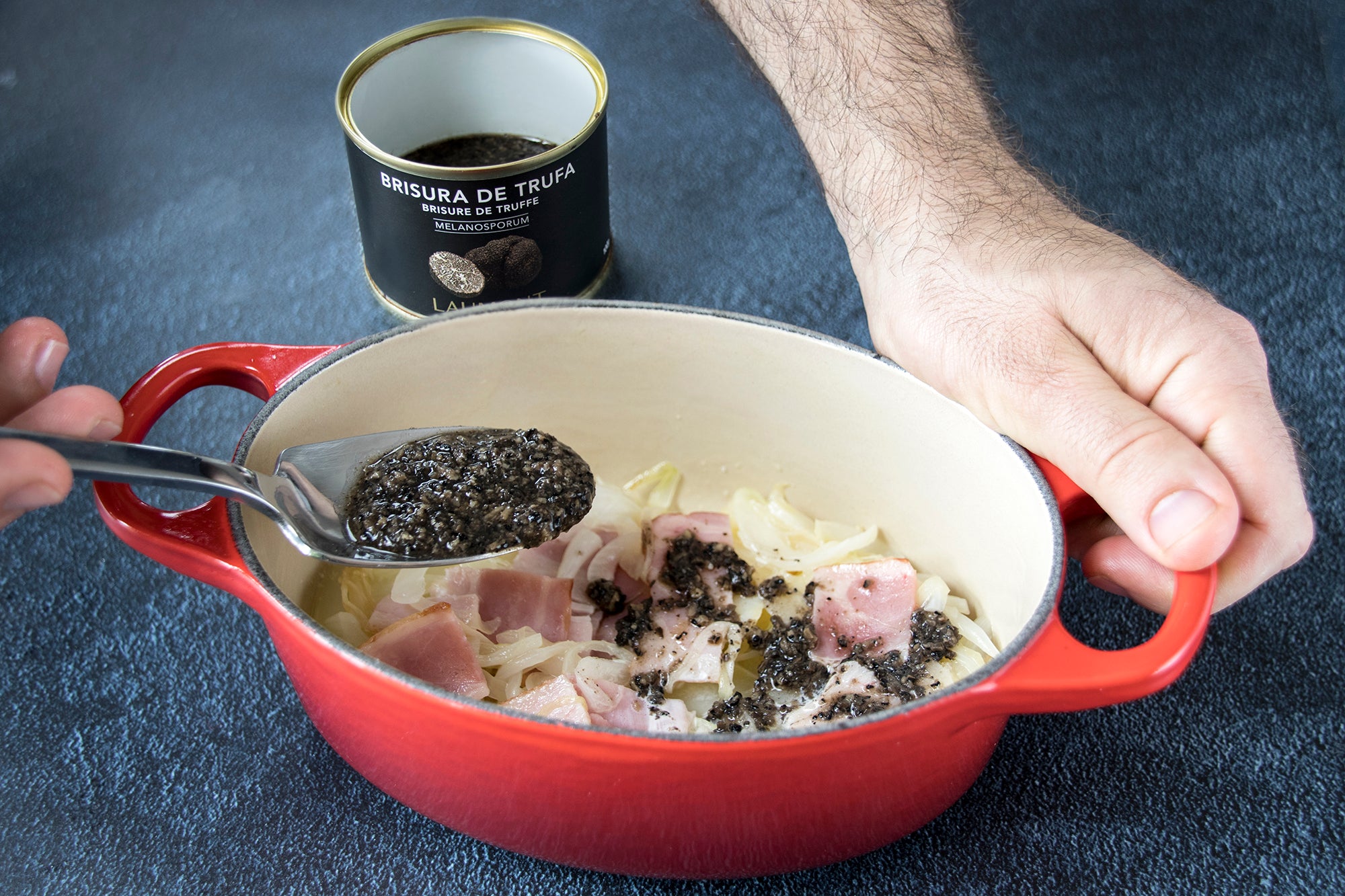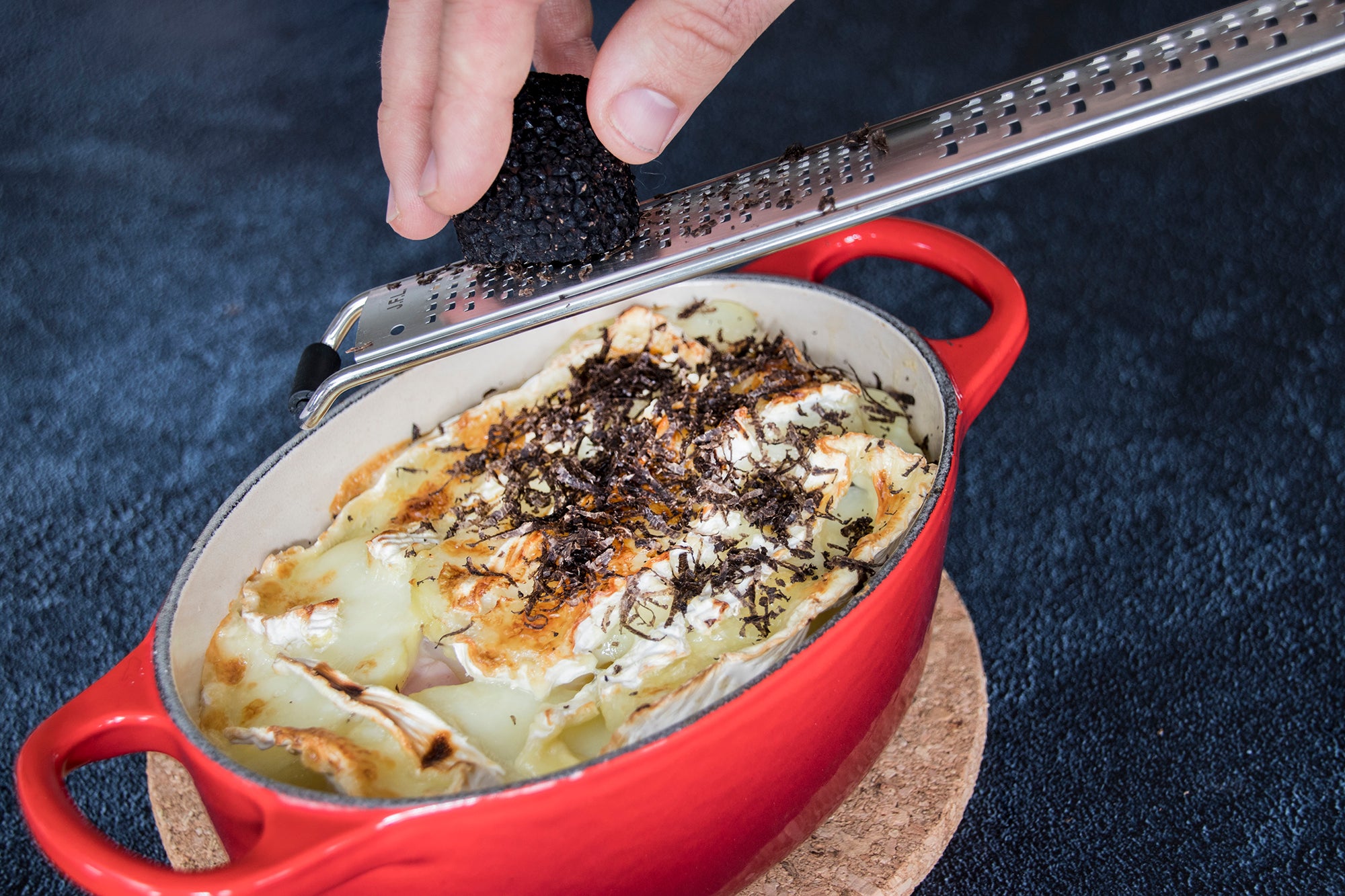 A comforting and deeply aromatic reinterpretation of the classic French tartiflette, this version incorporates Laumont black truffle breakings and fresh truffle to enrich every bite. Layers of creamy potatoes, melted cheese and crispy bacon come together with the earthiness of truffle for an unforgettable oven-baked dish.